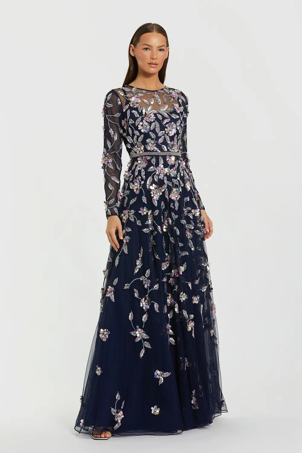 Exude timeless elegance in this long sleeve evening gown, exquisitely adorned with delicate floral embellishments. The intricate detailing shimmers with sophistication, while the graceful silhouette flatters every movement. Designed for formal occasions, this gown blends romance and refinement, making it a captivating choice for an unforgettable evening.