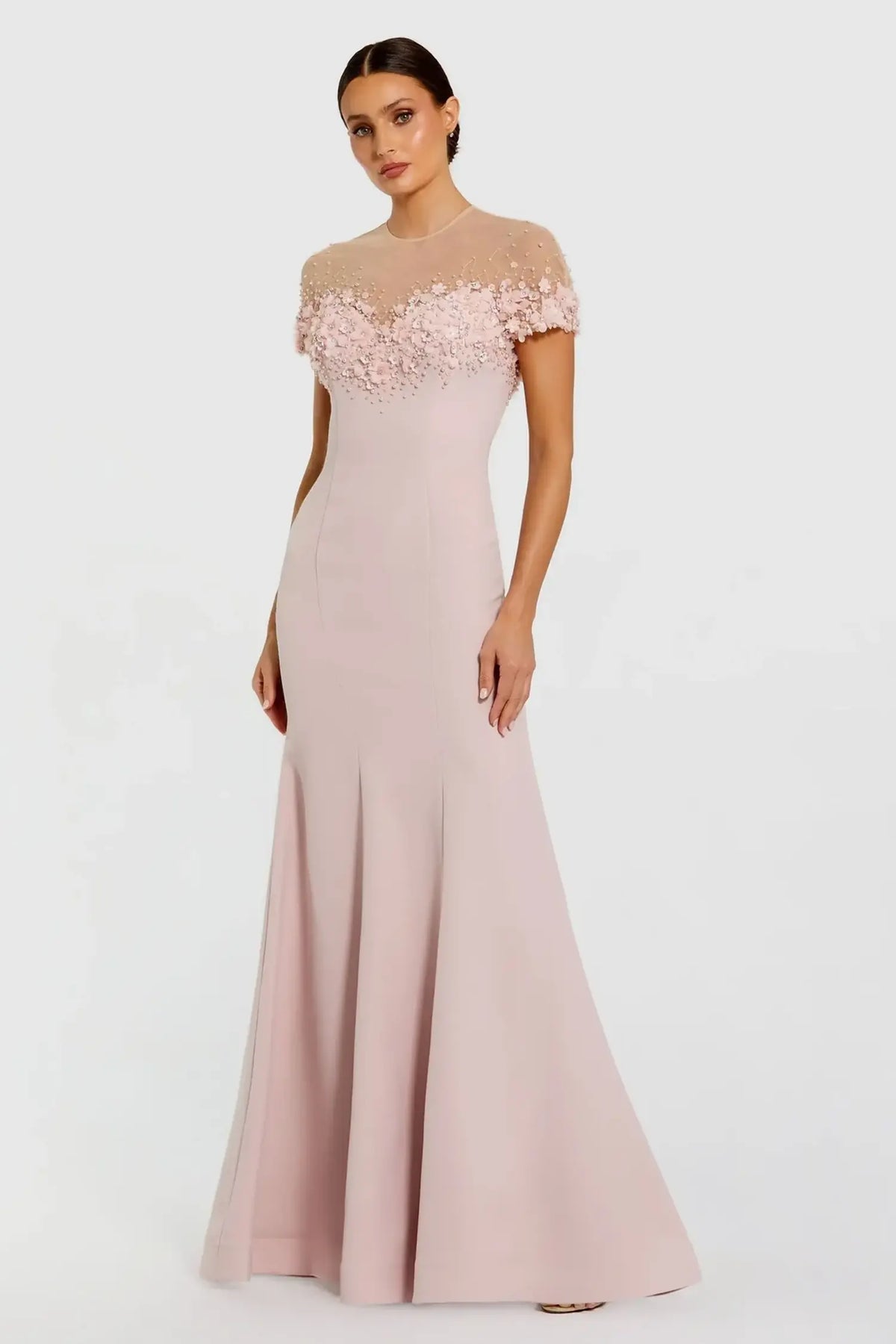 Graceful and refined, this crepe gown features a beautifully beaded illusion neckline that sparkles with every movement. The fitted mermaid silhouette flatters the figure, while the sleek design exudes timeless sophistication—making it a stunning choice for formal evenings, galas, or red-carpet events.