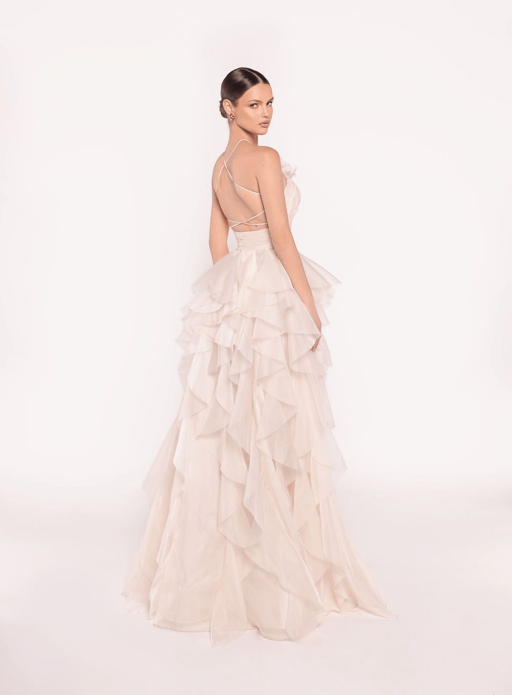 Tarik Ediz 98818 KIARA – Romantic Halter Gown with Floral Embellishment & Cascading Ruffle Skirt