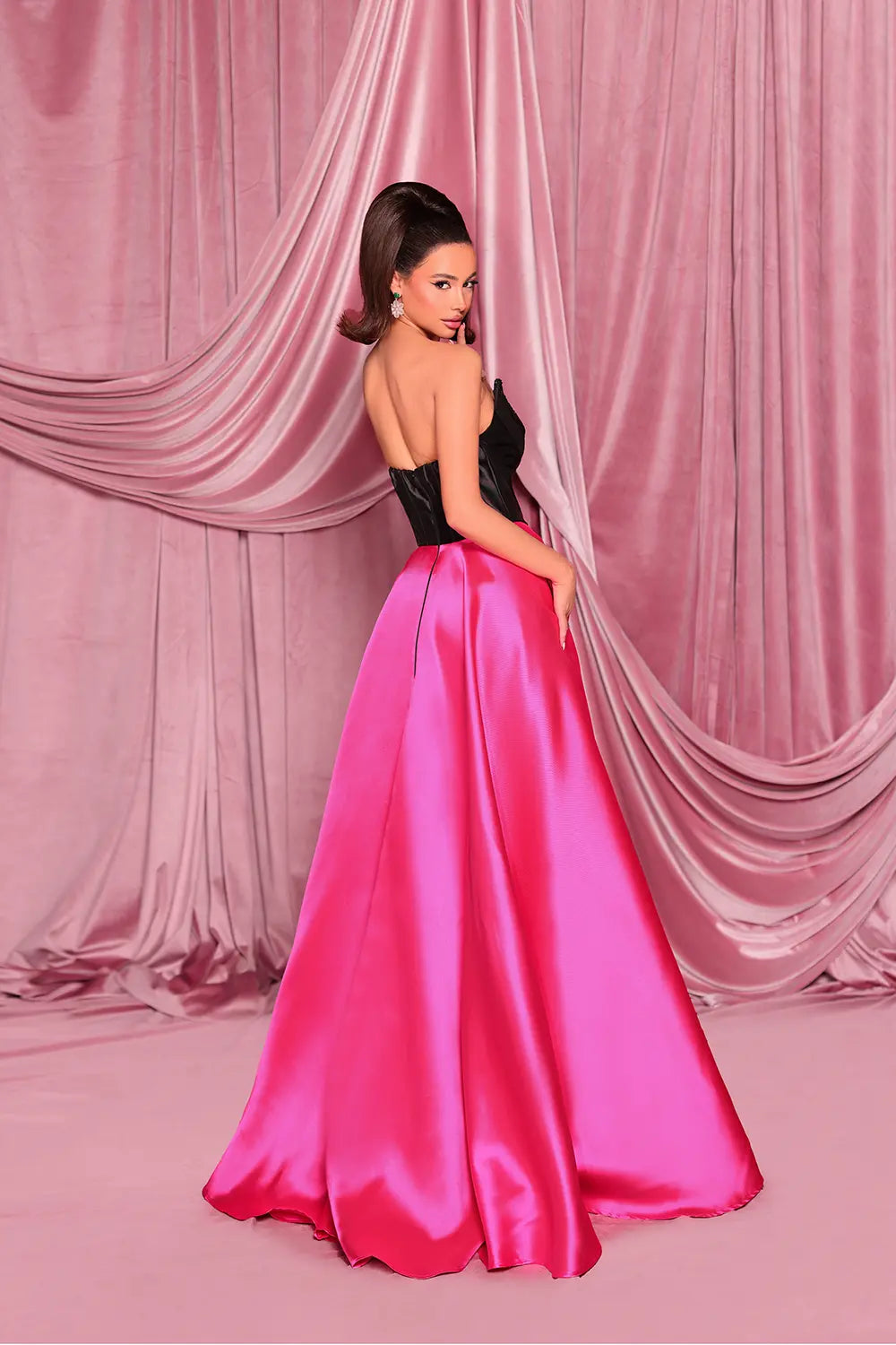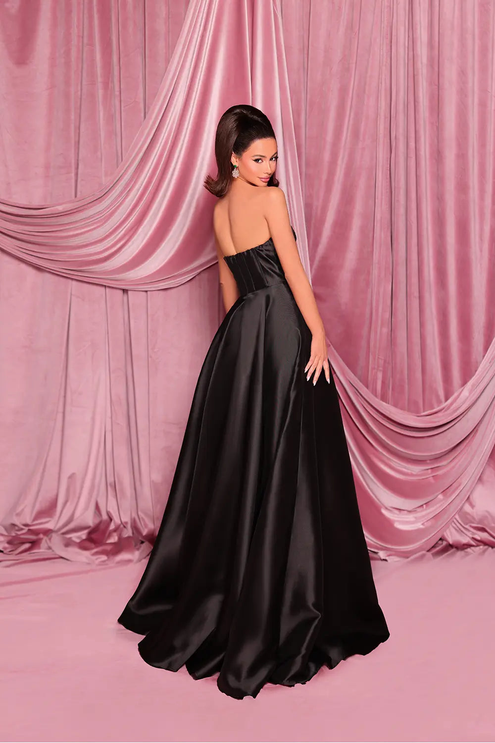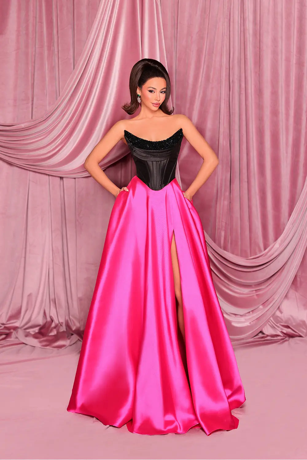 A statement ball-gown with a couture edge. NC3096 pairs a hand-beaded sweetheart neckline with a sculpted corset bodice and a luminous Mikado skirt finished with a thigh-high slit. Powerful, elegant, camera-ready.