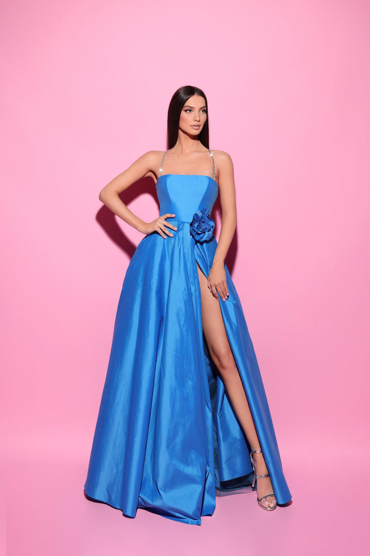 Tarik Ediz 54204 SENDY – Square Neckline Ball Gown with Slit & Floral Waist Detail