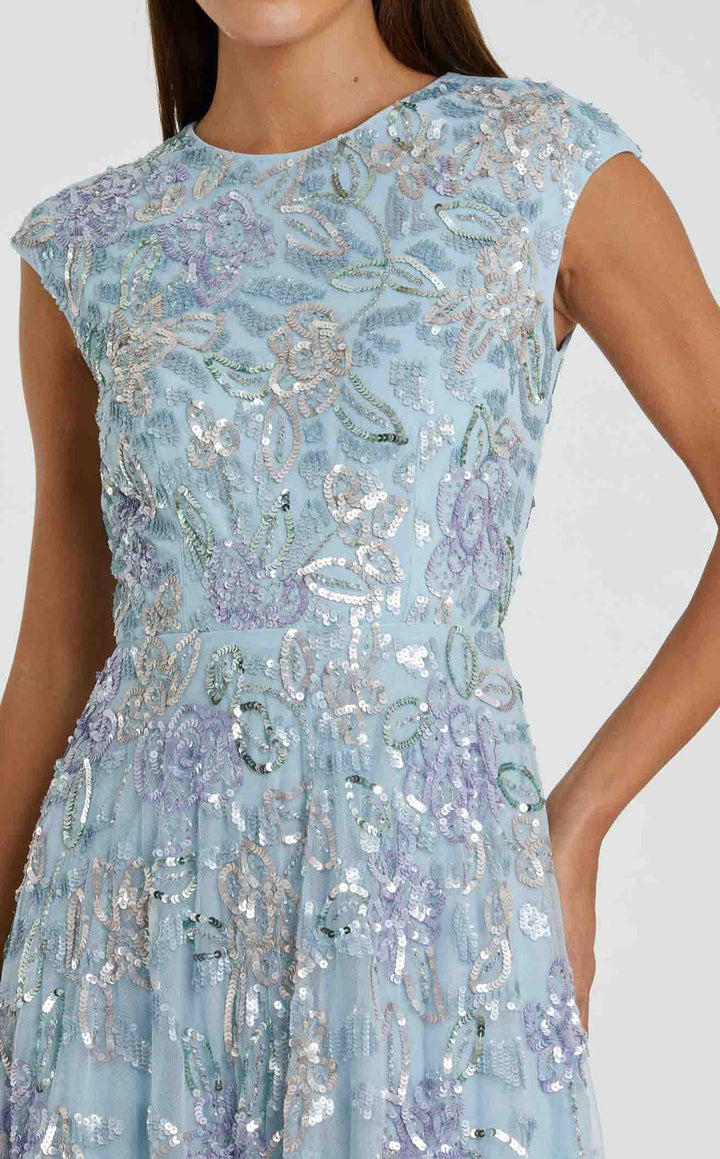 - Intricate floral sequin embellishments throughout bodice and skirt