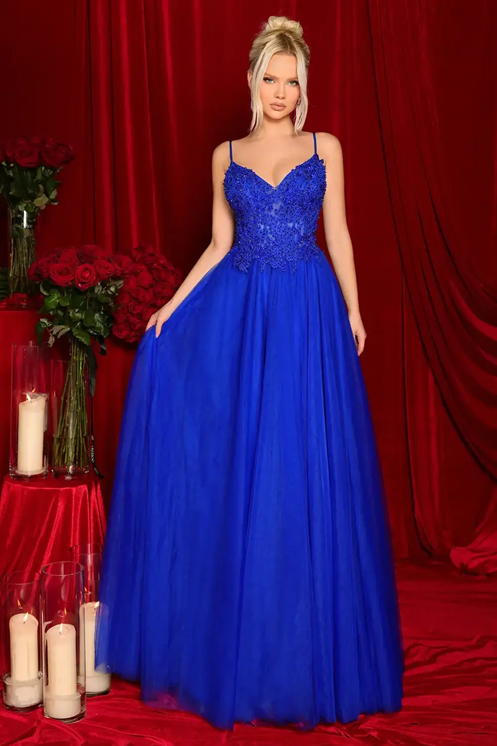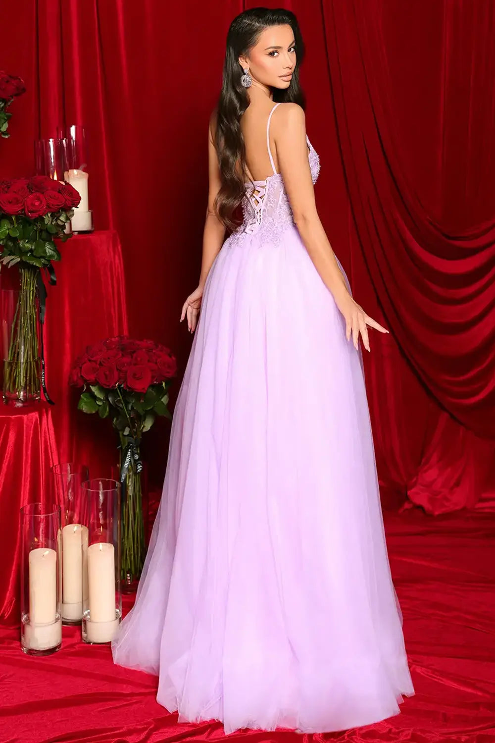 The Nicoletta NC3020 formal ballgown is designed for women who want to feel regal, elegant, and unforgettable. Its structured lace appliqué bodice features a semi-sheer corset effect that cinches the waist beautifully, while the full tulle skirt creates dramatic volume and sweeping movement. The delicate spaghetti straps and lace-up back add modern femininity, offering both adjustability and support.
