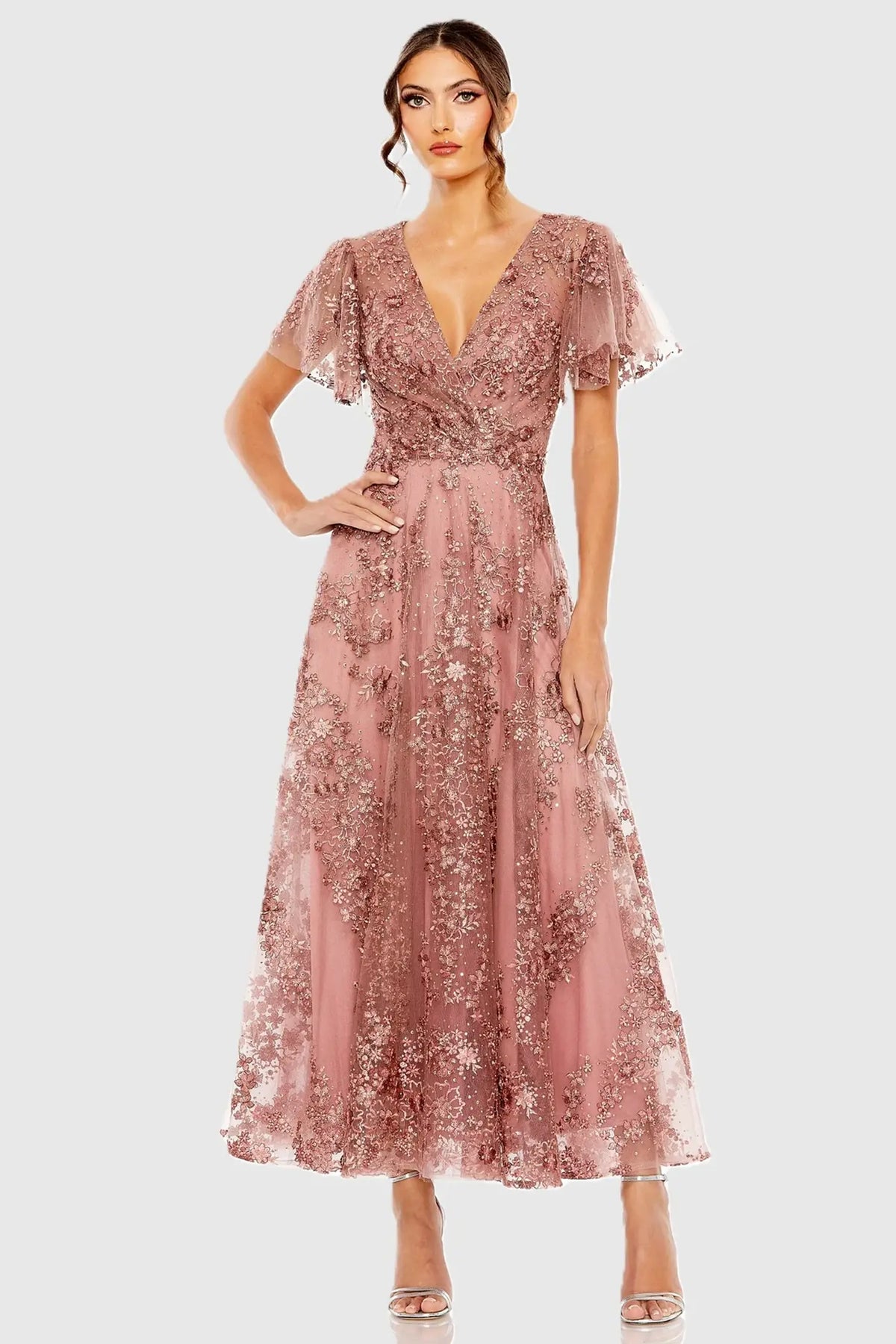 This elegant A-line dress from Mac Duggal is designed to flatter with ease and movement. Crafted in embroidered mesh, it features a faux-wrap bodice with a soft V-neckline and short flutter sleeves for a light, feminine feel. Heat-set rhinestones add a subtle sparkle throughout, catching the light without overwhelming the design.