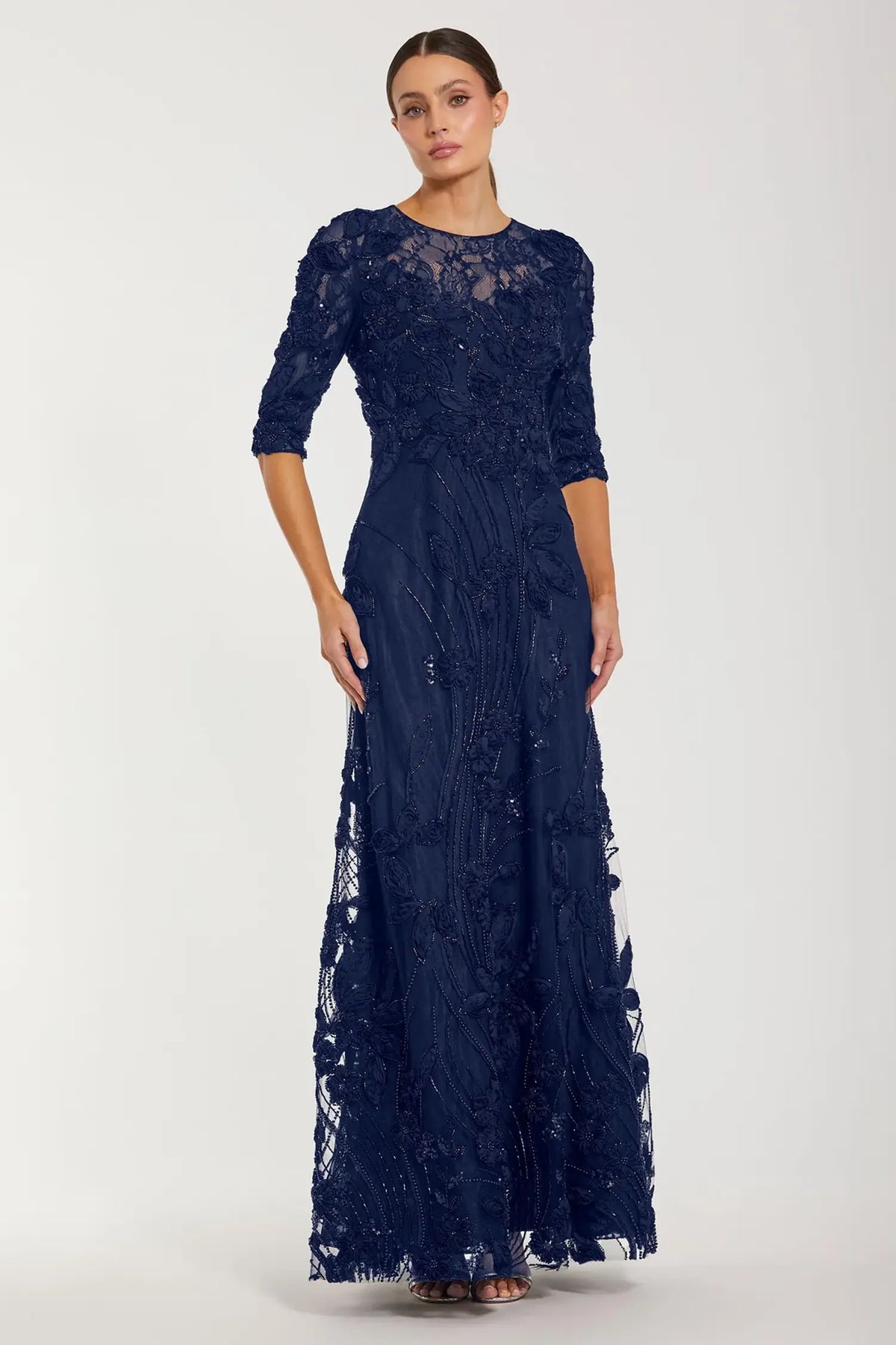 Mac Duggal Style 69016 High Neck Embellished Lace Gown with 3/4 Sleeves