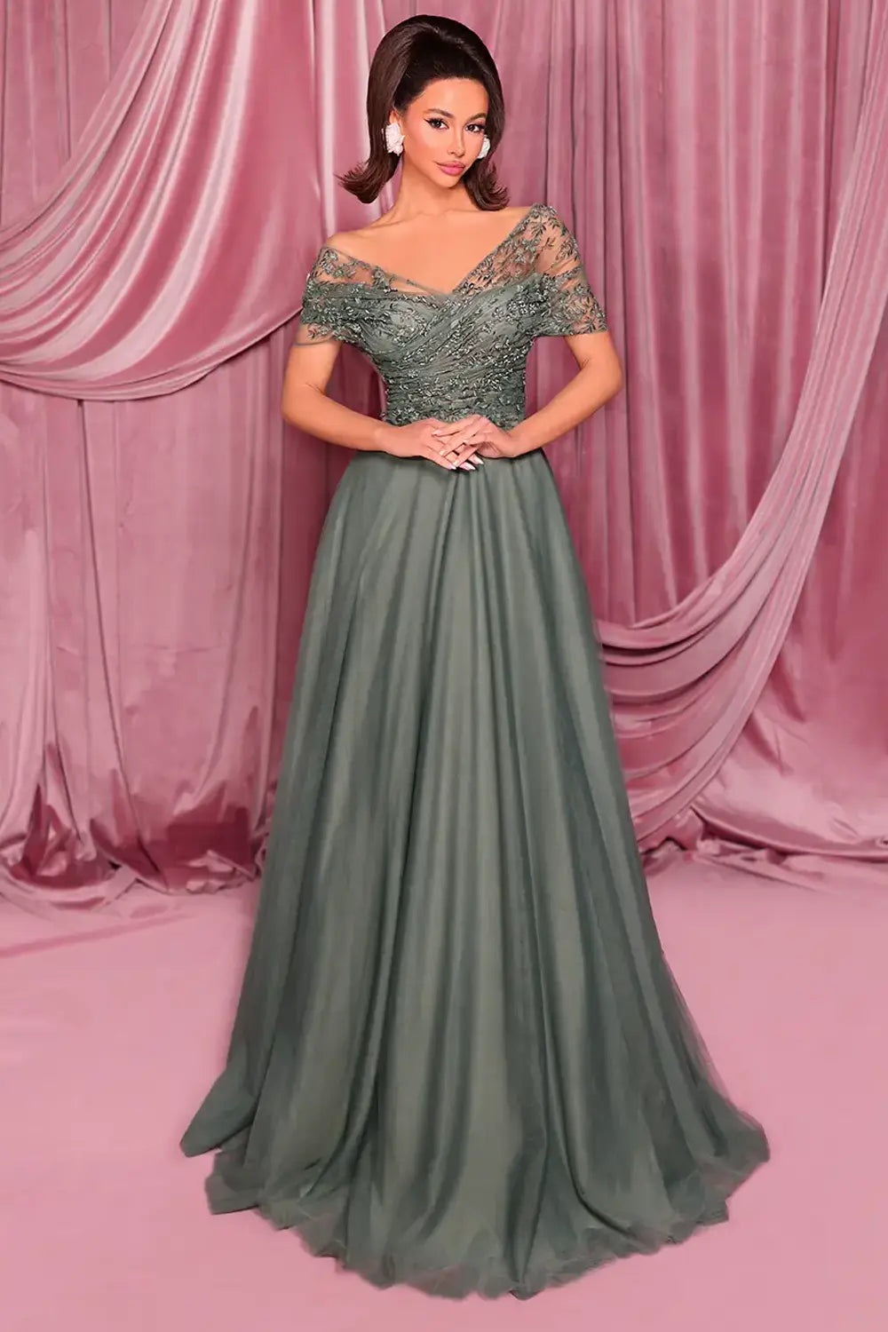 - A soft updo or side-swept curls to highlight the off-shoulder neckline and lace sleeves.