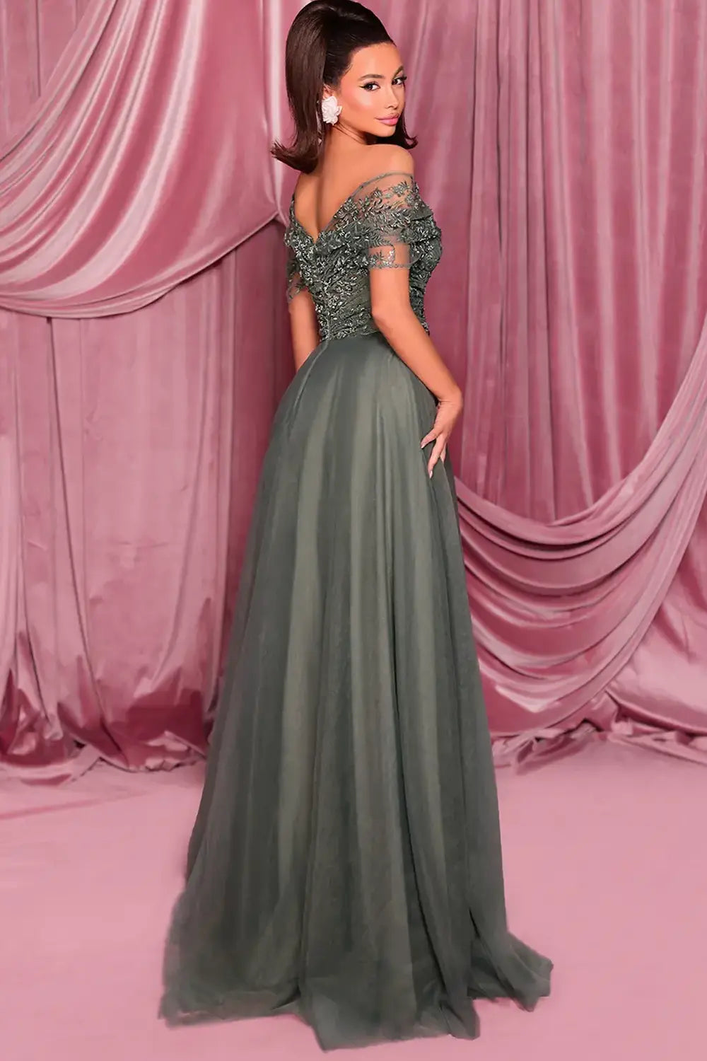 - A soft updo or side-swept curls to highlight the off-shoulder neckline and lace sleeves.