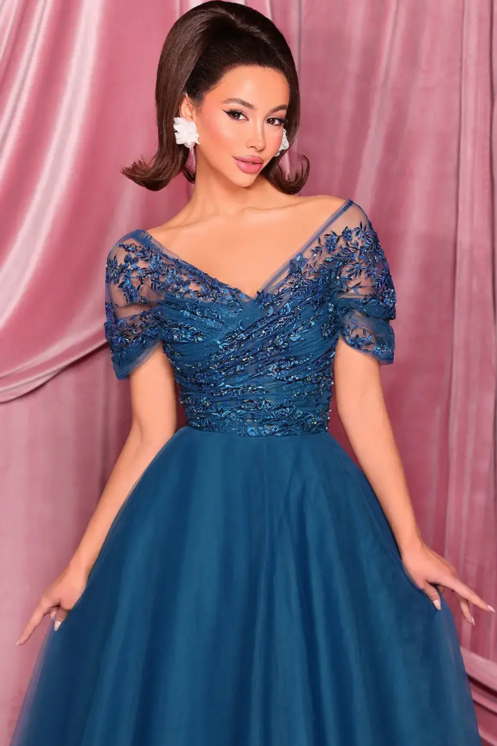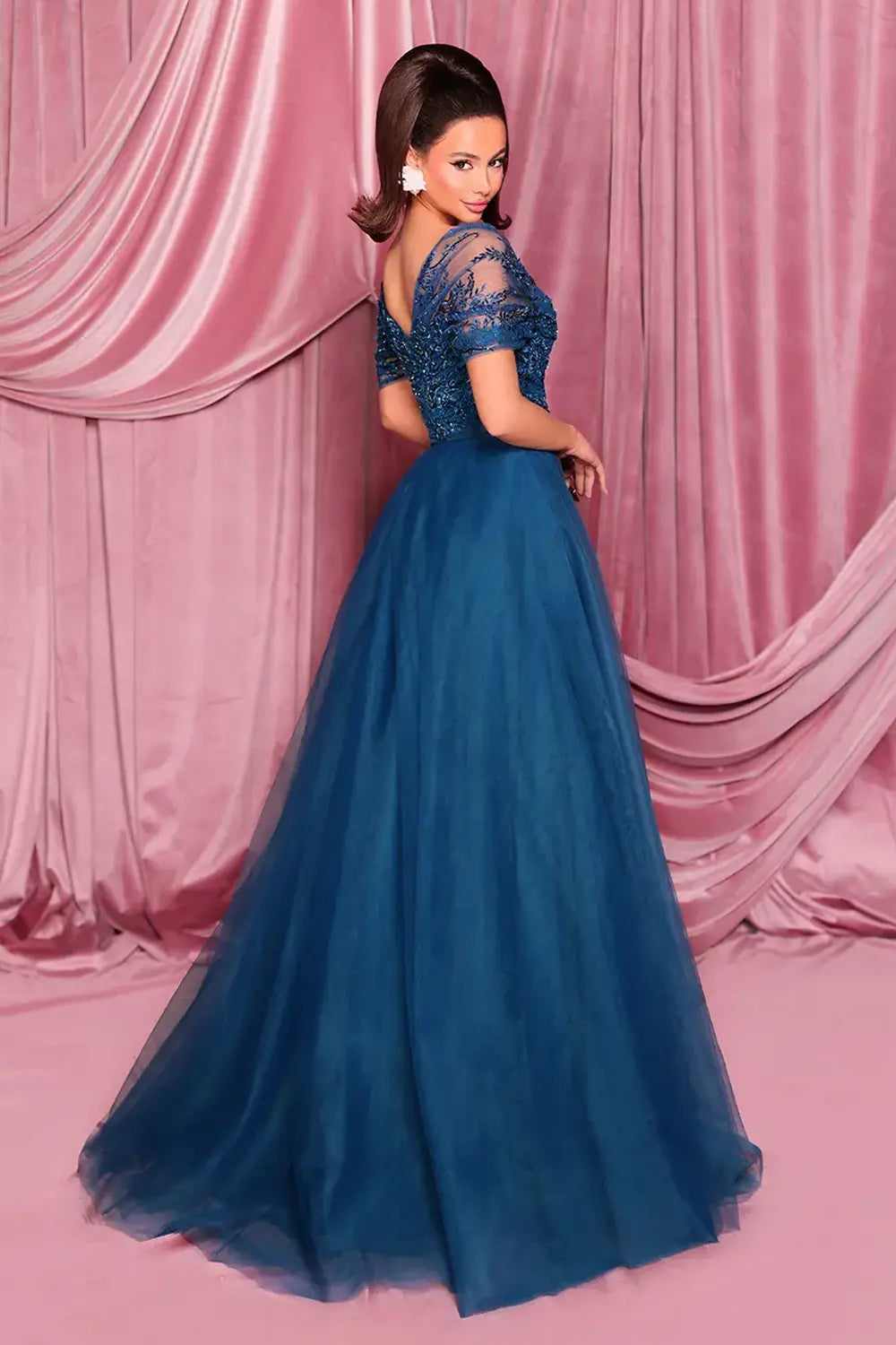 Available in Steel and Teal, this gown offers timeless versatility. Steel delivers understated sophistication, while teal brings a rich, modern jewel-tone look.