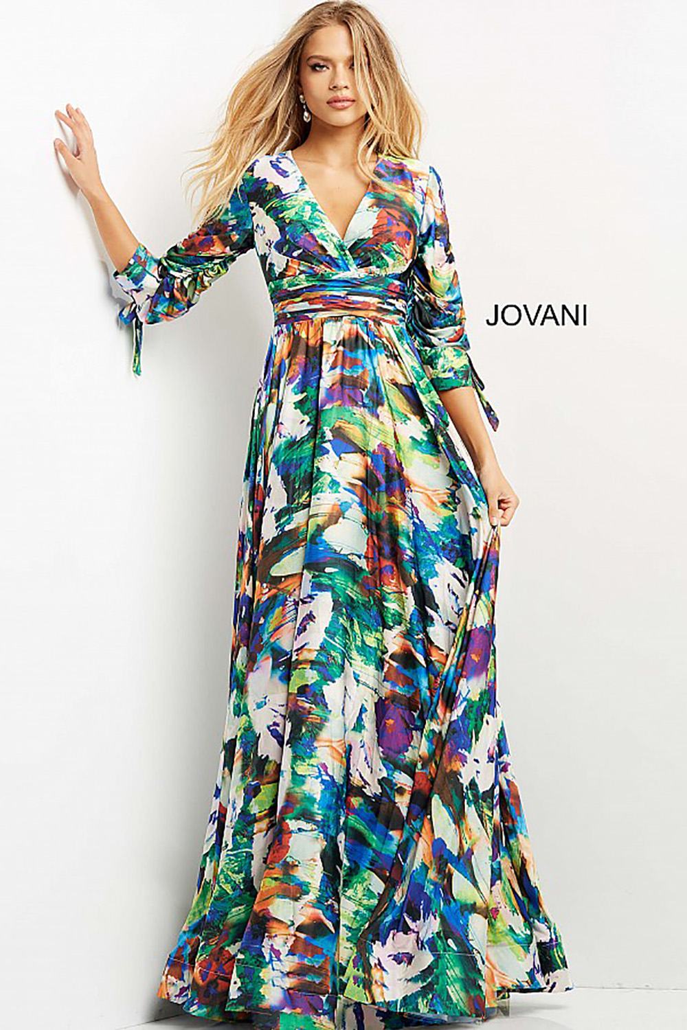 Print V Neck Three Quarter Sleeve Prom Gown Jovani 08584