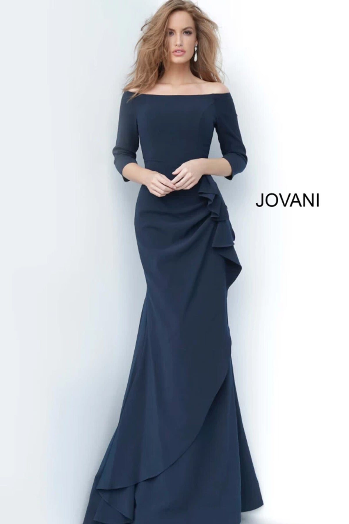 The Jovani 00446 gown combines minimalist sophistication with modern elegance. Designed from smooth stretch crepe, this off-the-shoulder masterpiece contours the figure in a sleek sheath silhouette that gently flares at the hem. The three-quarter sleeves add refinement and coverage, while the cascading side ruffle introduces soft movement and a sculptural finish.