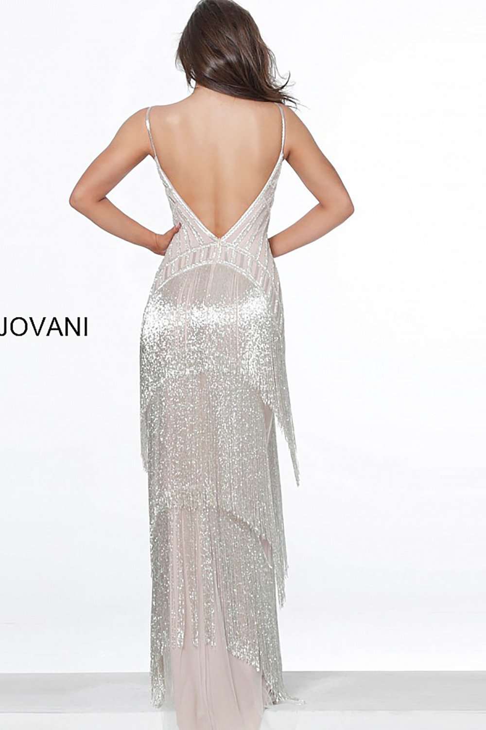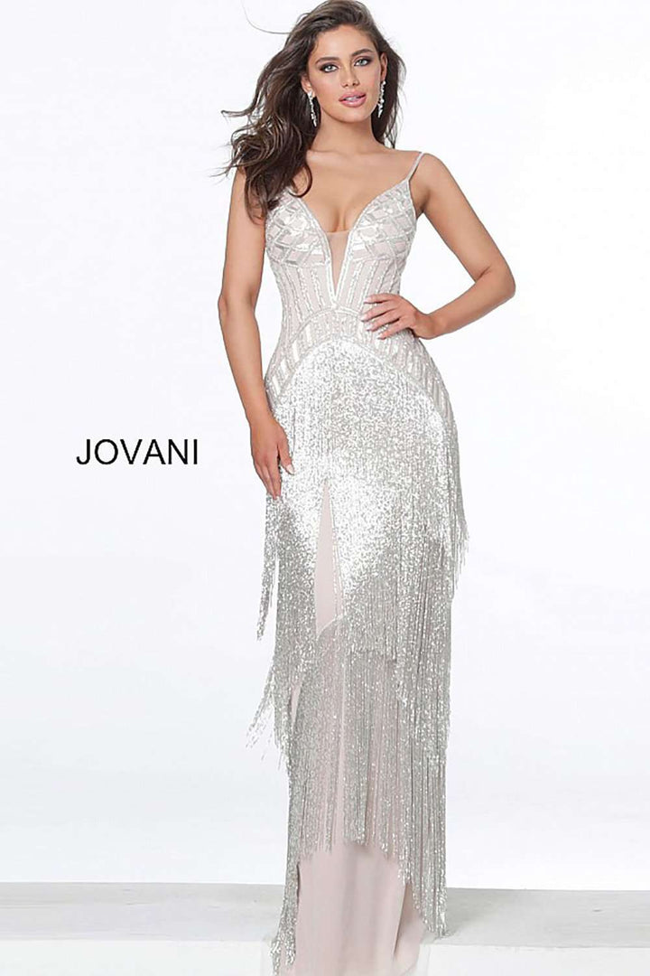 Silver Nude Fringe Plunging Neck Dress Jovani 8101